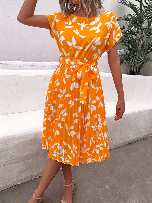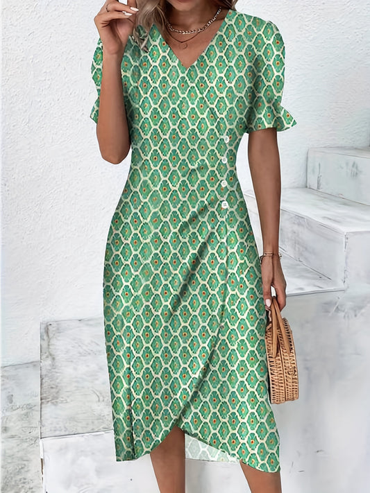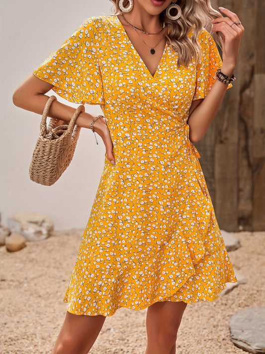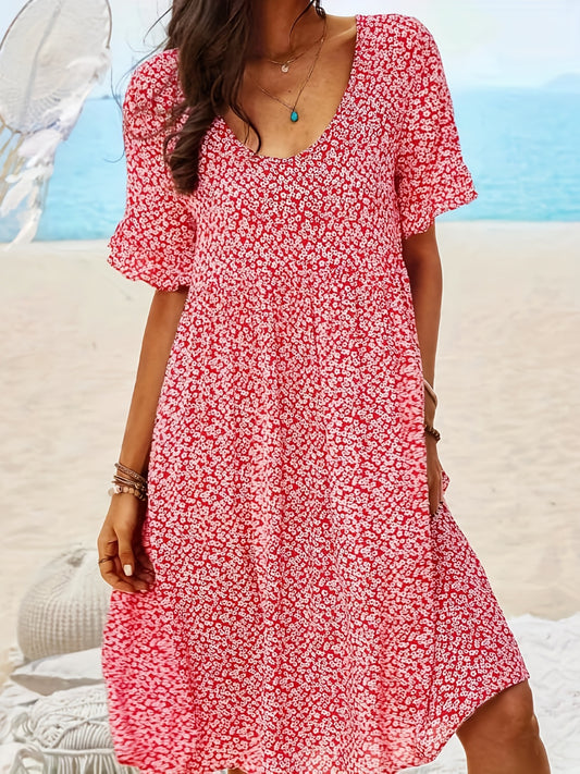 「lovevop」Boho Floral Print V Neck Dress, Casual Short Sleeve Dress For Spring & Summer, Women's Clothing
