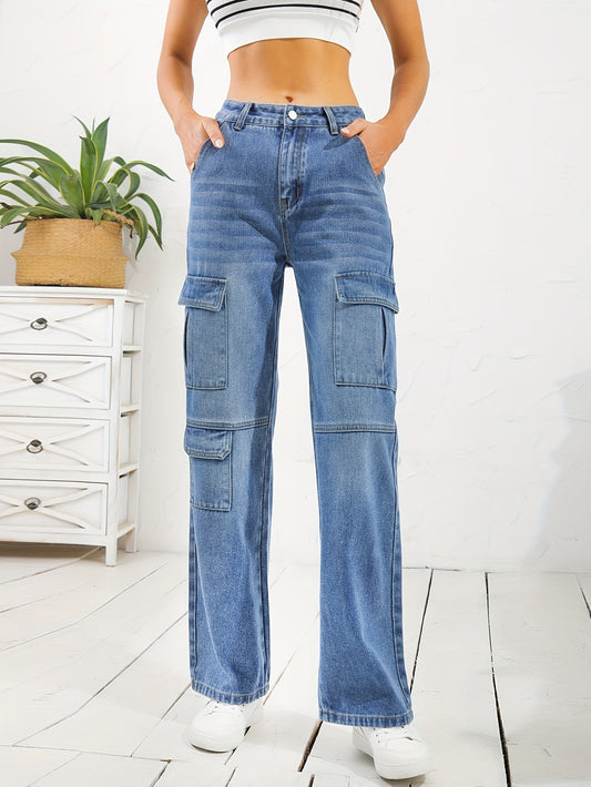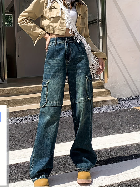 「lovevop」Causal Solid Color Double Buttons Jeans, Slash Pockets Loose Chic Straight Leg Denim Pants,Women's Denim Jeans & Clothing