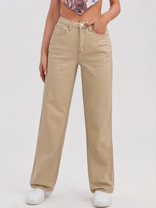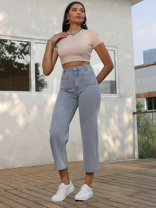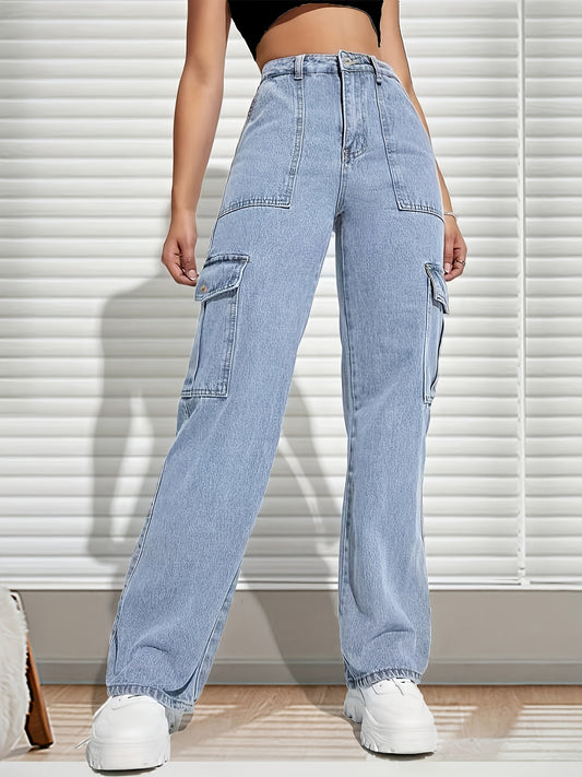 「lovevop」Flap Side Pocket Black High Waist Denim Pants, Cargo Pocket Casual Wide Leg Jeans, Stylish & Trendy, Women's Denim Jeans & Clothing
