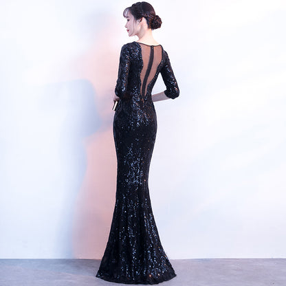 1102 Evening Dress Black Banquet Winter Medium Sleeve Long Fish Tail Elegant Slim Host Annual Meeting Dress Dress Woman