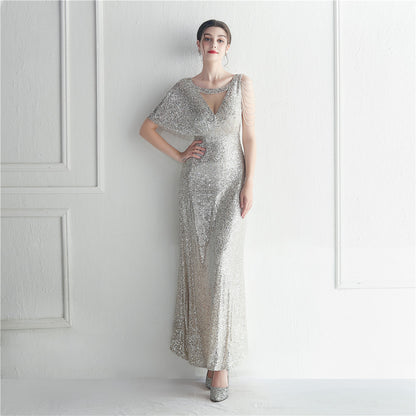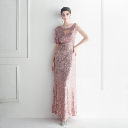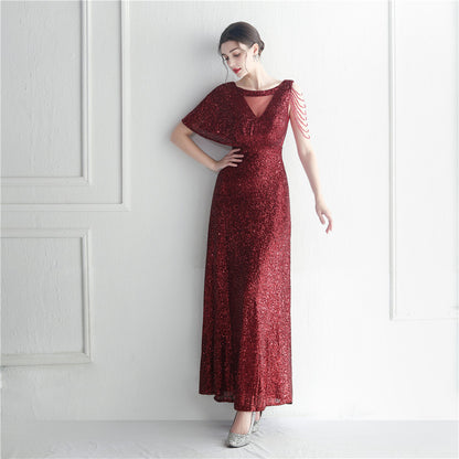 19932 #Hot trade craft bead lotus leaf sleeve mesh perspective bridesmaid etiquette celebration dinner long evening dress
