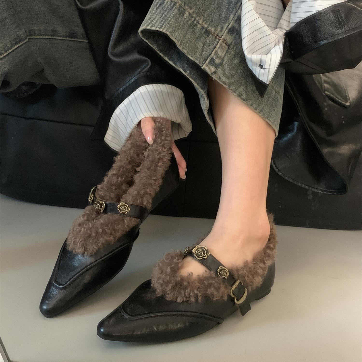2025 Evening breeze temperament velvet Mary Jane shoes pointed inner height increase wool shoes warm and comfortable small leather shoes
