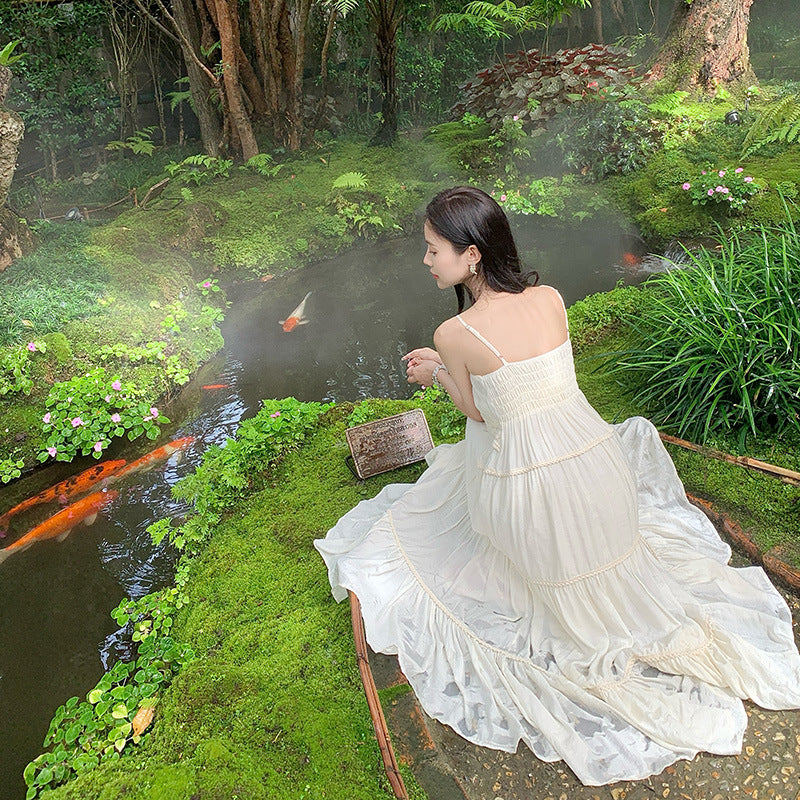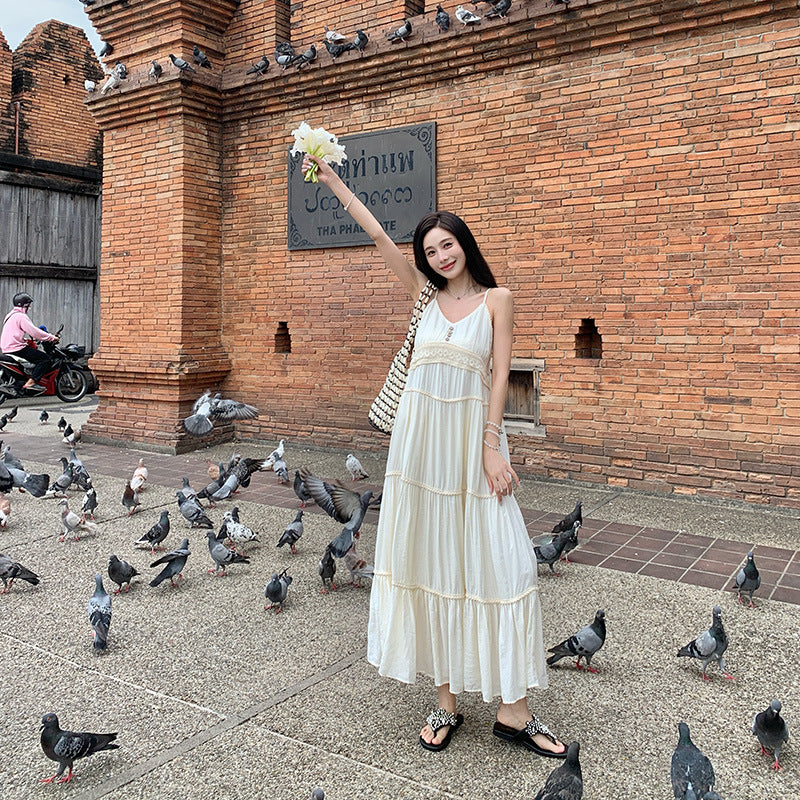 2025 gentle style beige holiday suspender skirt women's summer new temperament Muse fan high waist super good-looking dress