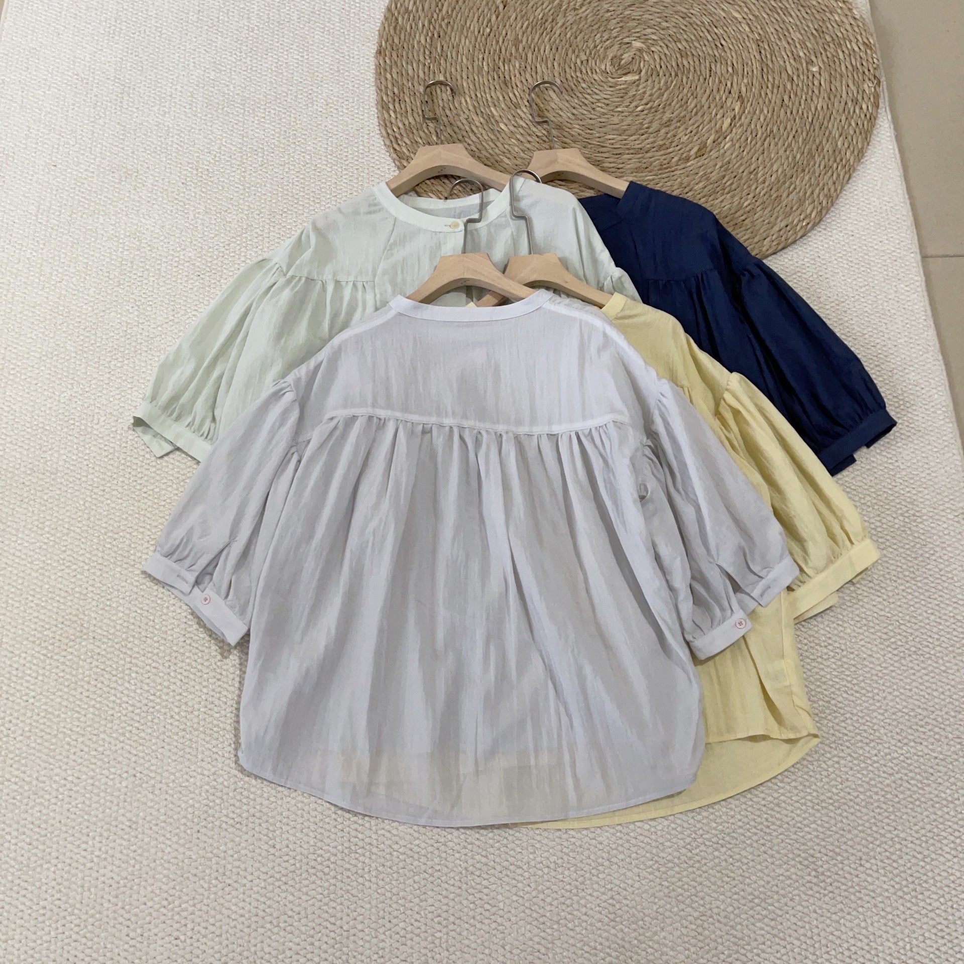 2025 Summer Japanese Literature and Art Mori Small Stand-Up Collar Middle Sleeve Color Button Doll Shirt Small Shirt