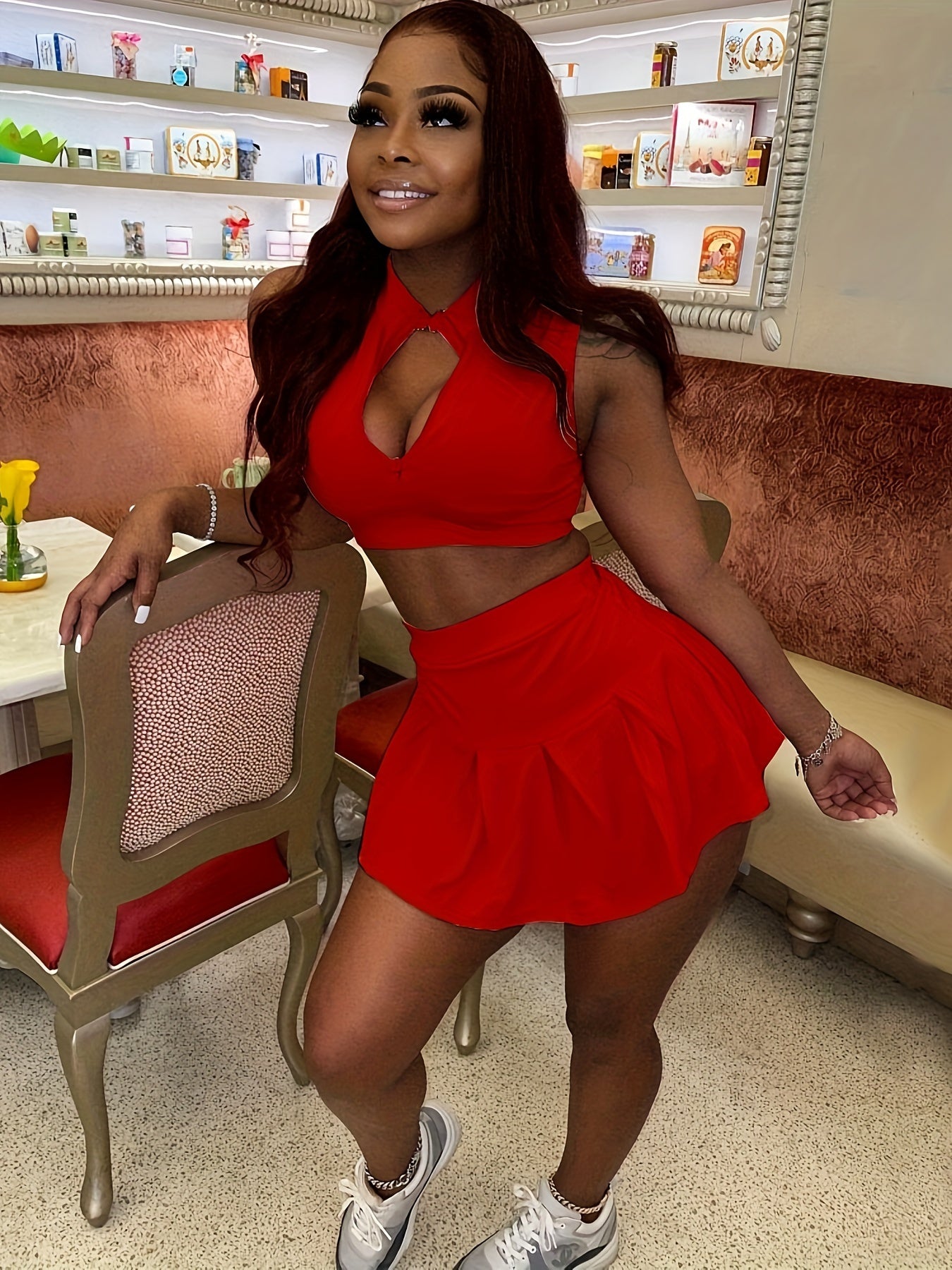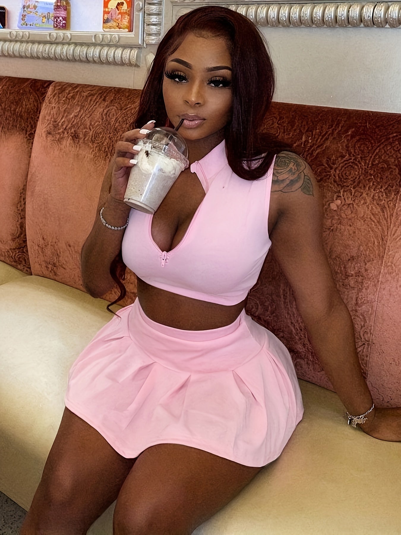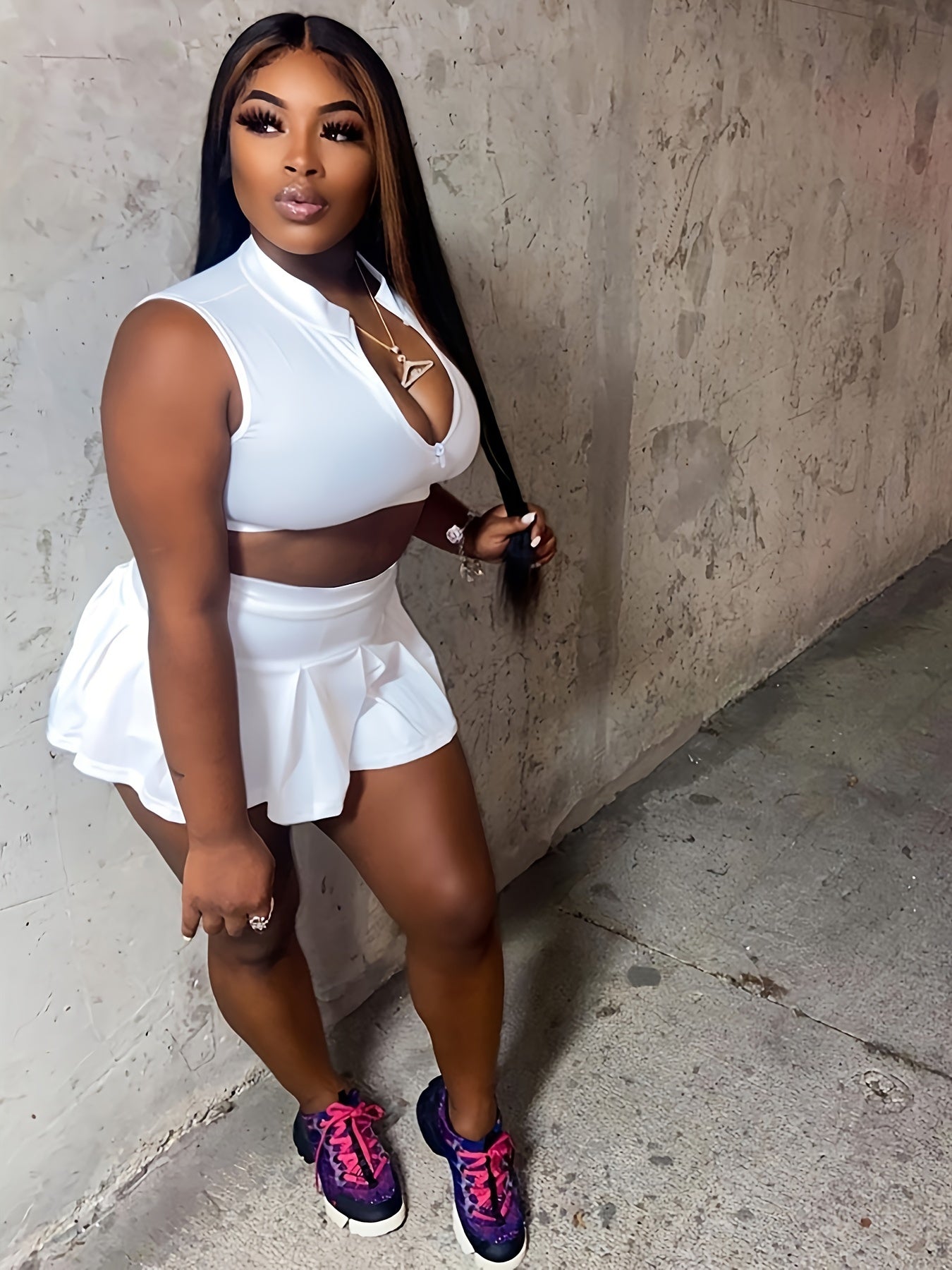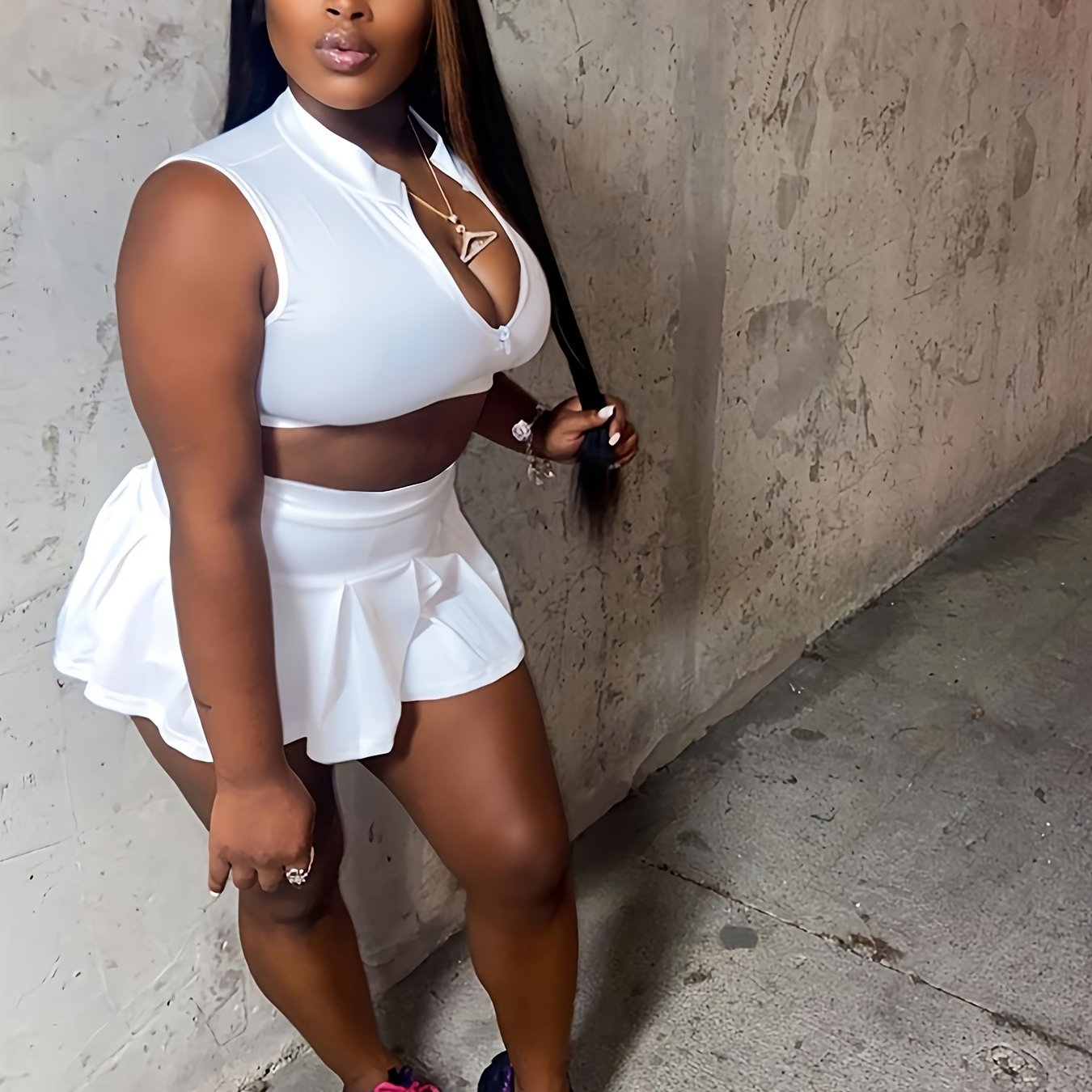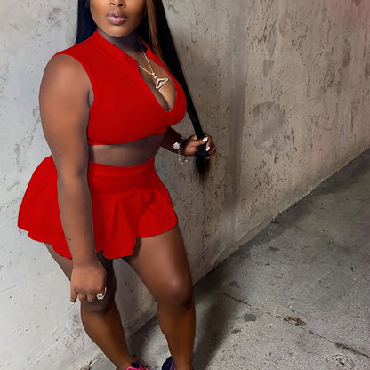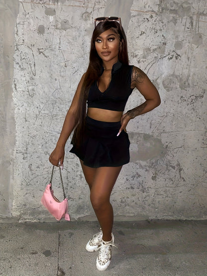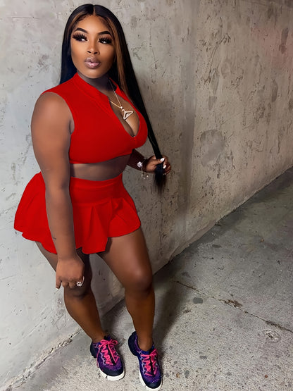 Alluring Solid Color Sleeveless Crop Top & Pleated Flare Skirt Set - Zip-up Lapel Collar, High Waist, Feminine Two-Piece Outfit for Women