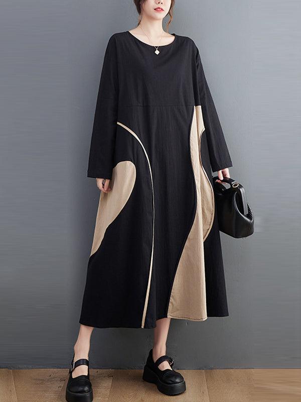 lovevop Casual Long Sleeves Loose Contrast Color Printed Round-Neck Midi Dresses