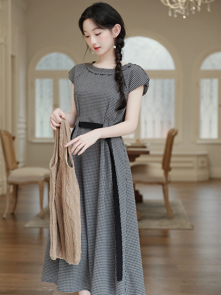 Daily miscellaneous literature and art summer is very beautiful, black and white classic cotton and linen plaid skirt, waist reduction dress, beautiful small skirt