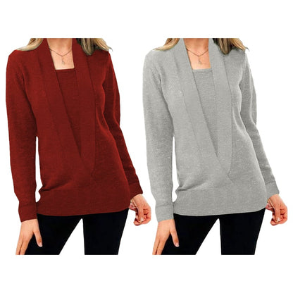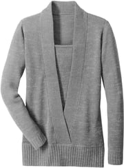 Professional, casual, and yet still dressy, this versatile plunging v-neck sweater top and faux cami underneath provide the right amount of detail with long capped sleeves.