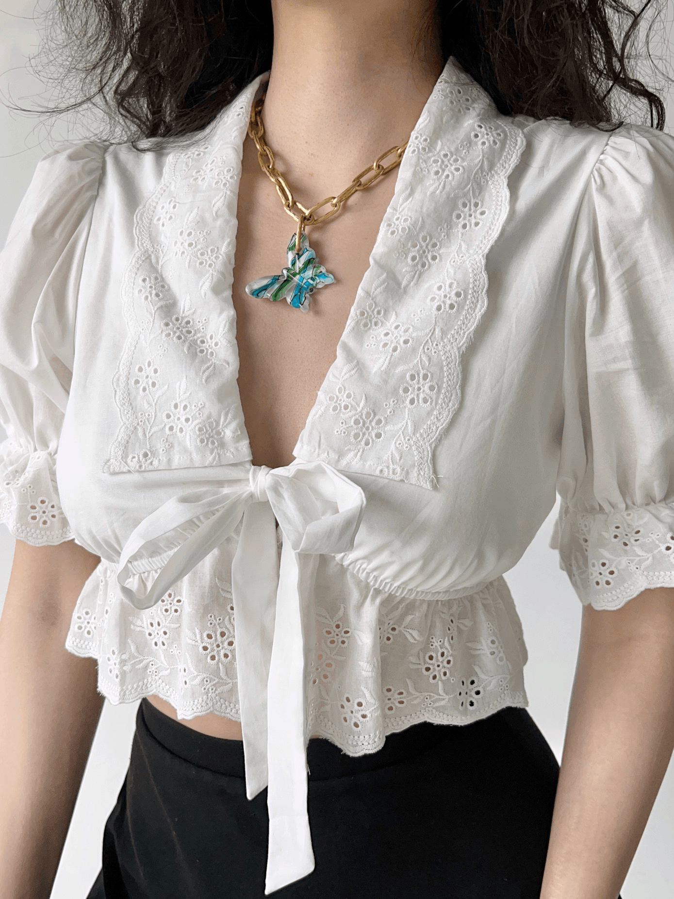 lovevop French Court Style Puff Sleeve Embroidered Tie White Shirt