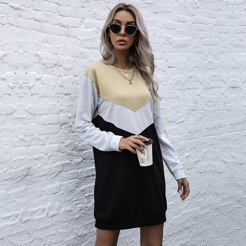 LOVEVOP New popular new 2025 contrasting colors loose crew neck sweater skirt autumn long-sleeved splicing dress women