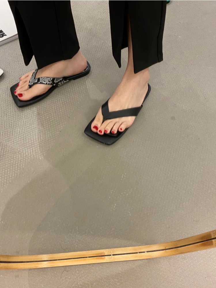 lovevop New Summer Women Flip Flop Flat Heel Casual Outdoor Beach Slides Ladies Square Toe Slip On Sandal Shoes Open Toe Slides