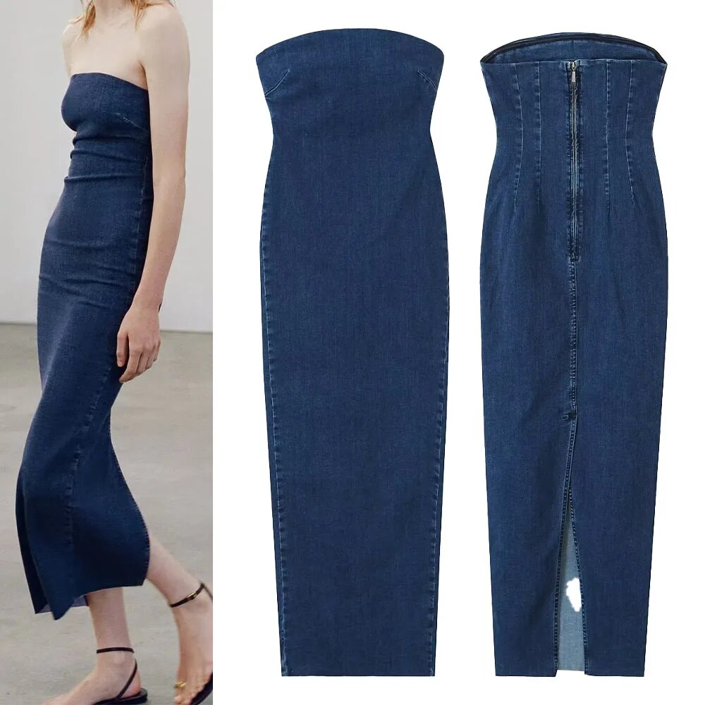 Lovevop- New women's clothing 2024 temperament fashion casual one-neck tube top slim fit raw edge slit denim dress