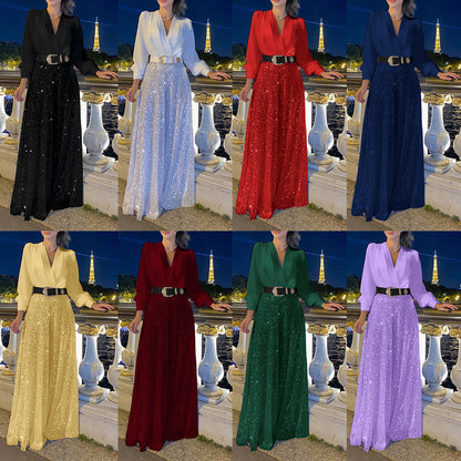 New women's clothing new models, fashionable V-neck long-sleeved shirt temperament elegant waist and thin sequins wide legs