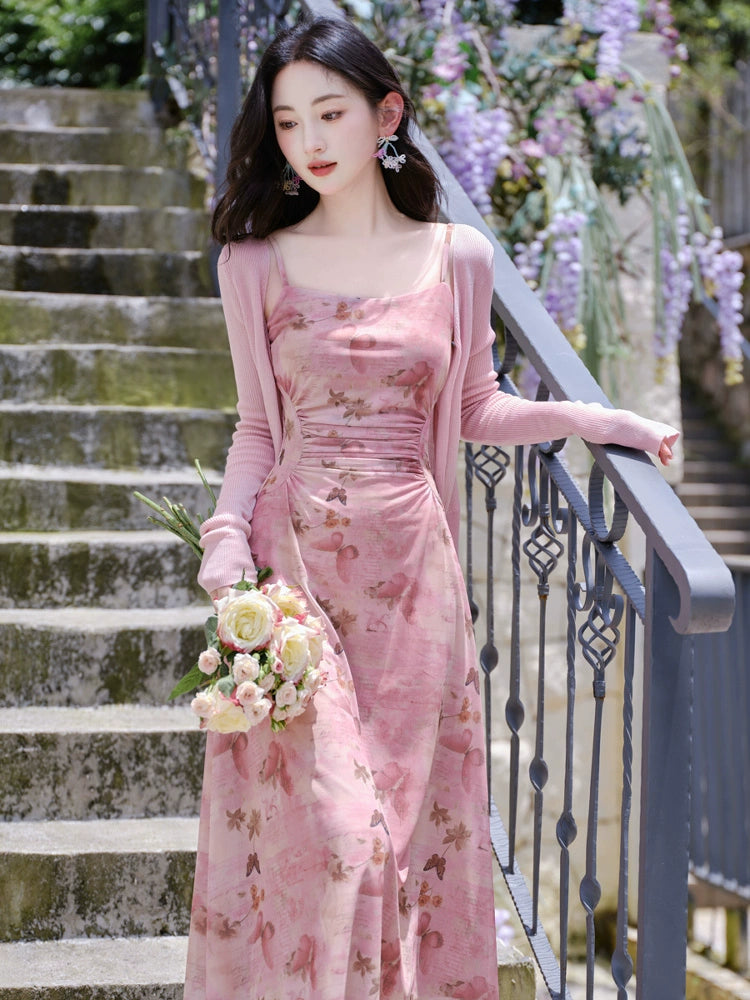 Summer wear beautiful small skirt pink floral suspender dress women's seaside vacation sunscreen cardigan two-piece set