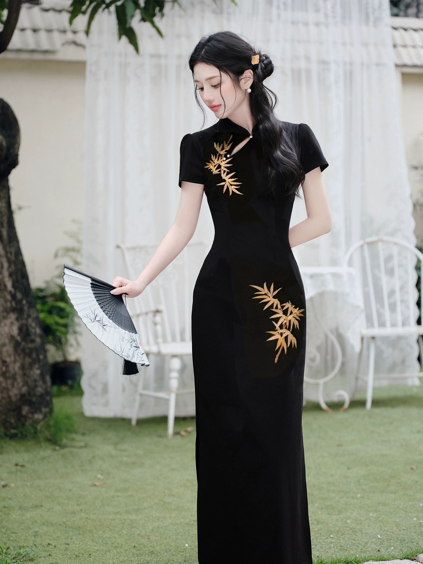 Summer women's clothing new Chinese style black national style golden bamboo embroidered retro cheongsam dress elegant temperament hip-wrapped dress