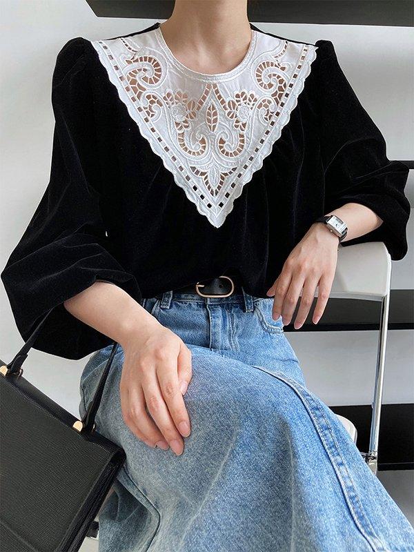 lovevop Urban Puff Sleeves Hollow Split-Joint Round-Neck Blouse Top