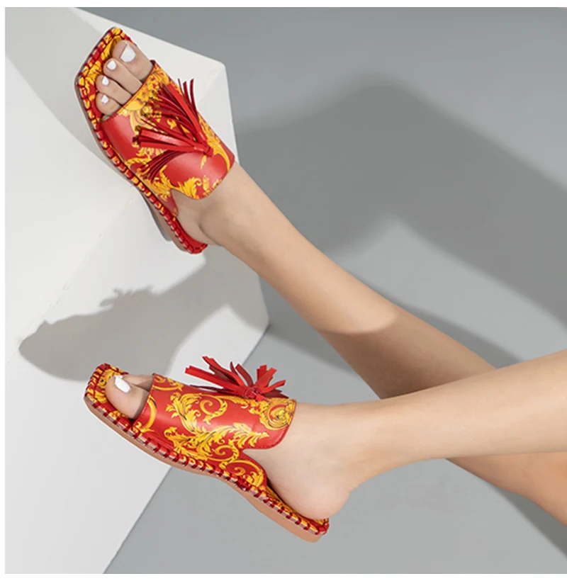Back to school lovevop Women Home Summer Slippers Woman Retro Mules Tassel Totem Square Toe Slides Ladies Casual Flats Female Comfortable Plus Size