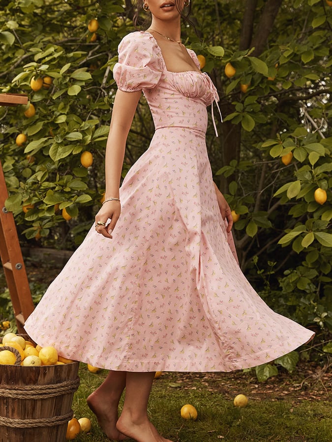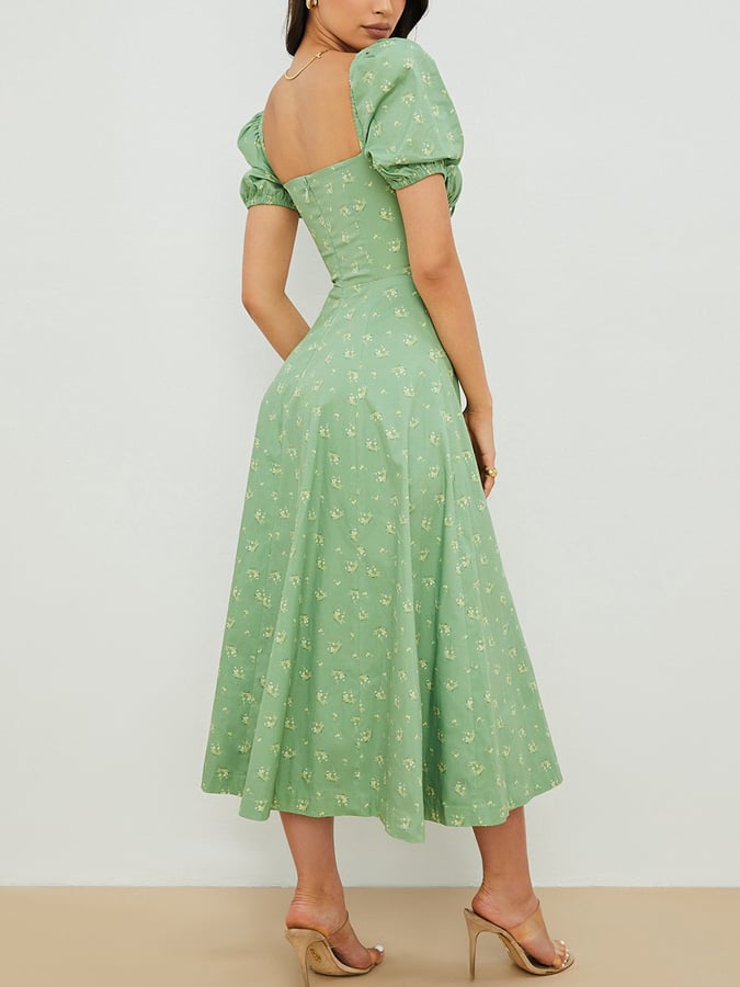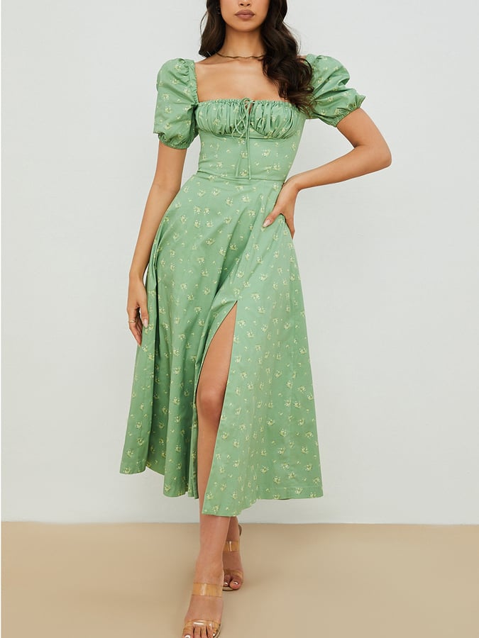 Women'S Sweetheart Collar Puff Sleeve Floral Slit Maxi Dress