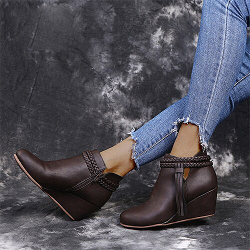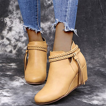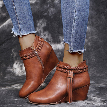 Back To School lovevop Women's Tassel Anle Boots Woman PU Leather Wedges Women Casual Weave Pumps Ladies Comfortable Shoes Female Footwear Big Size